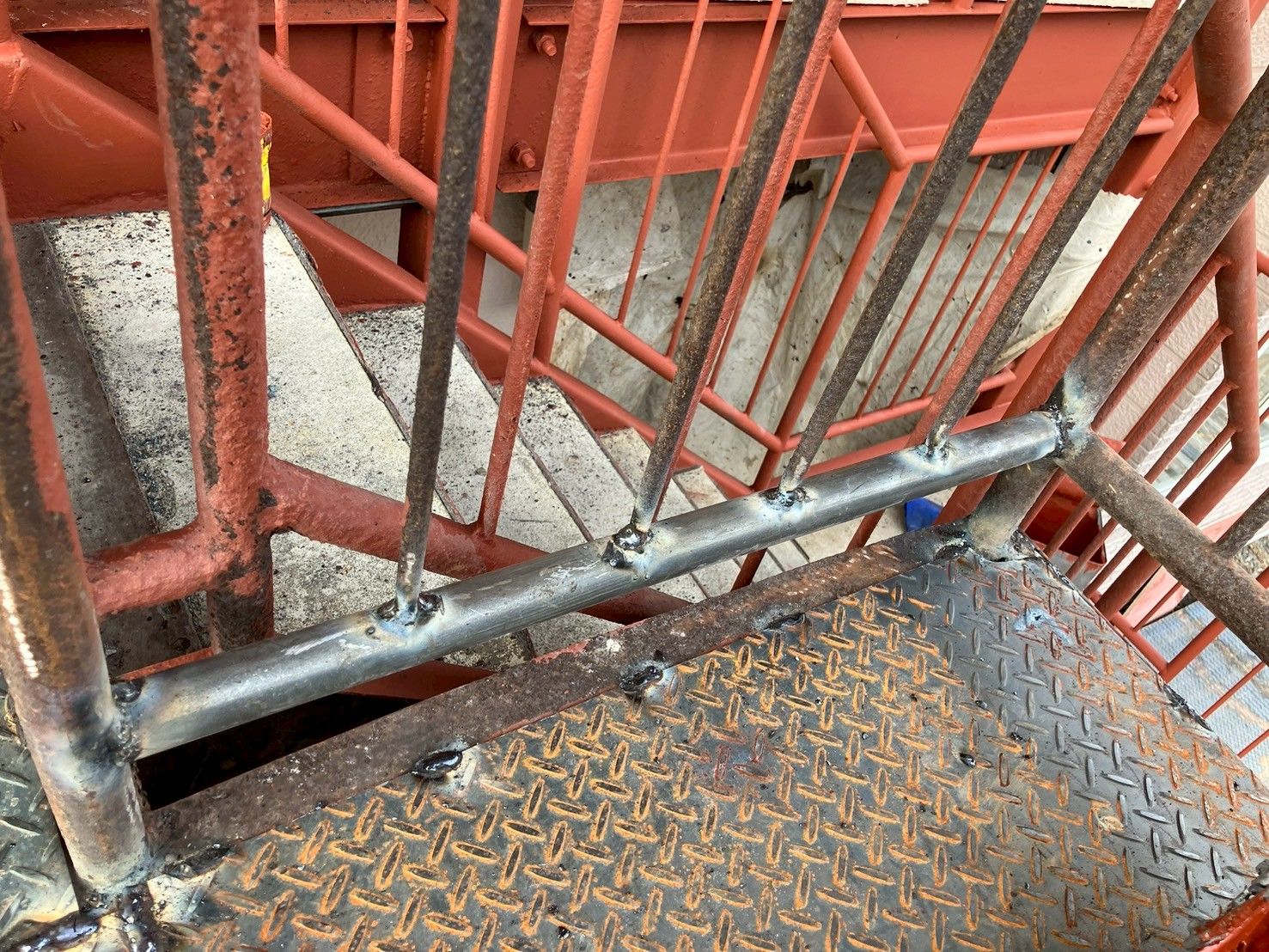 鉄骨の劣化というと、どうしても外階段ばかりに目が向きがちです。ですが実際には、鉄骨物件で点検や修理の対象になる部位は階段だけではありません。アパートやマンションなら外階段、共用廊下、踊り場、手すり、ベランダの鉄格子、避難ハッチまわり、鉄骨の支柱、庇の下地、階段を支える骨組みなど、多くの場所に鉄部が使われています。ビルや施設では、非常階段、屋上機器の架台、外部手すり、ルーバー下地、看板支持部材なども劣化リスクを抱えています。国土交通省の建築物事故概要でも、階段だけでなく看板支柱などの鋼製部材が腐食で損傷・転倒した事例が整理されています。